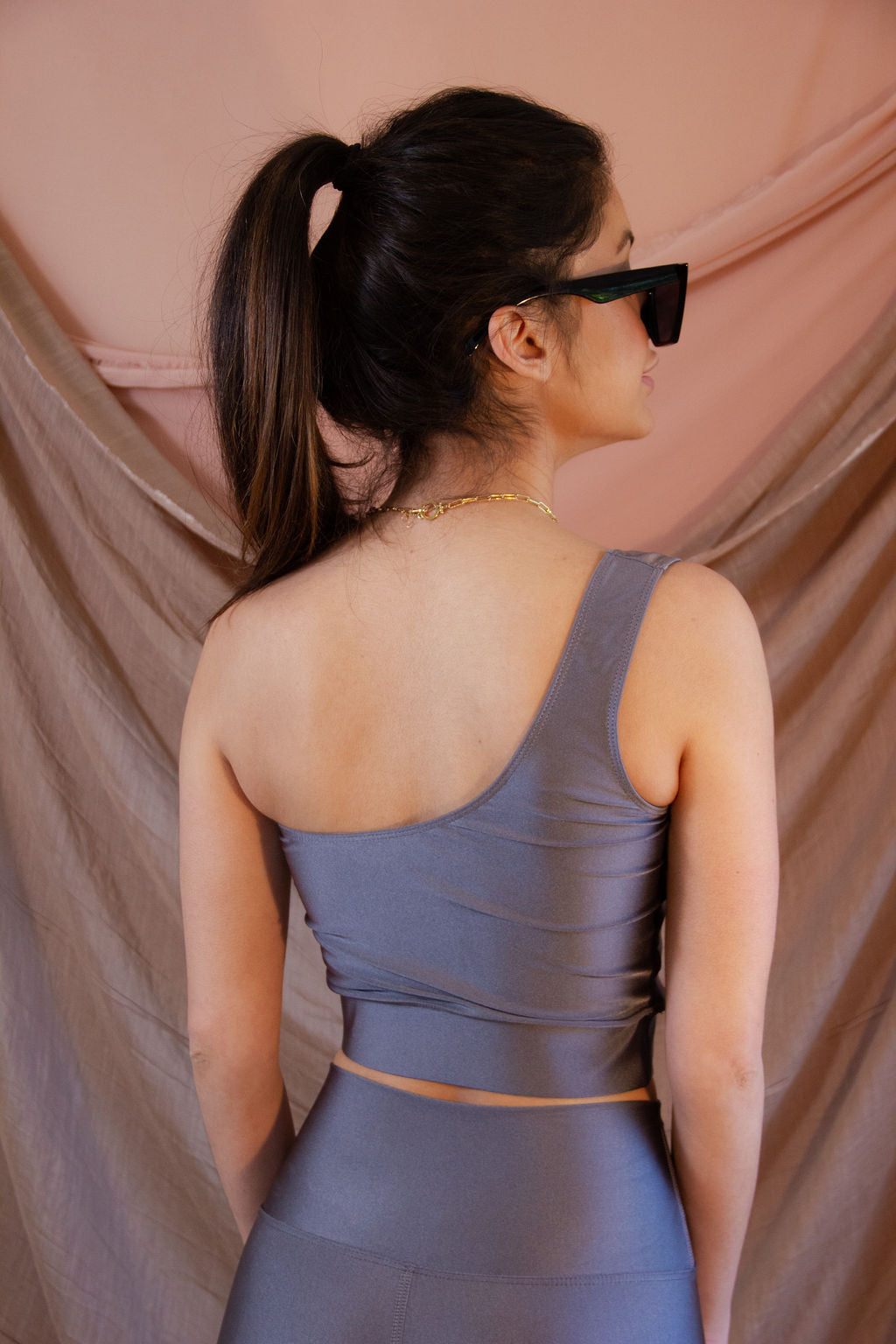 Cool as a cucumber. The CoolMove One Shoulder Bra Tank is a hybrid workout bra/crop top that will take you from dinner plans to pilates. Like our classic One Shoulder Bra Tank, it features a relaxed fit with an asymmetrical one-shoulder strap for an edgier look  and is made from our special CoolMove fabric: making it shiny, soft, and cooling thanks to eucalyptus. That means you stay clean and cool during even the sweatiest of gym sessions. Moreso, you get more wear in between washes, which saves water, energy, and time.