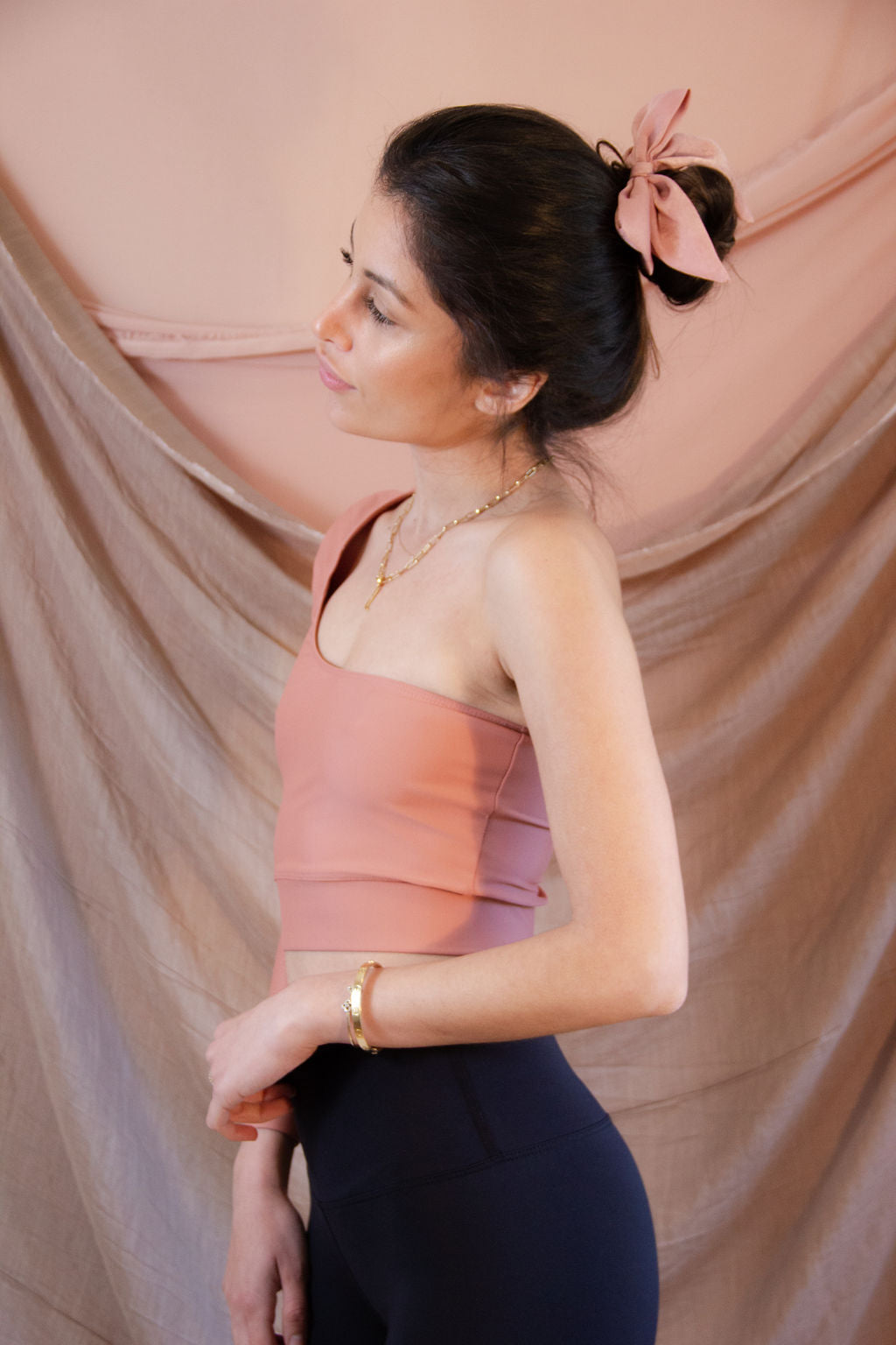 From studio to street. The Air Top is a hybrid workout bra/crop top that will take you from dinner plans to pilates. Featuring a relaxed fit with an asymmetrical one shoulder sleeve for an edgier look. Constructed with seamless, recycled fabric and dyed with organic, natural ingredients.