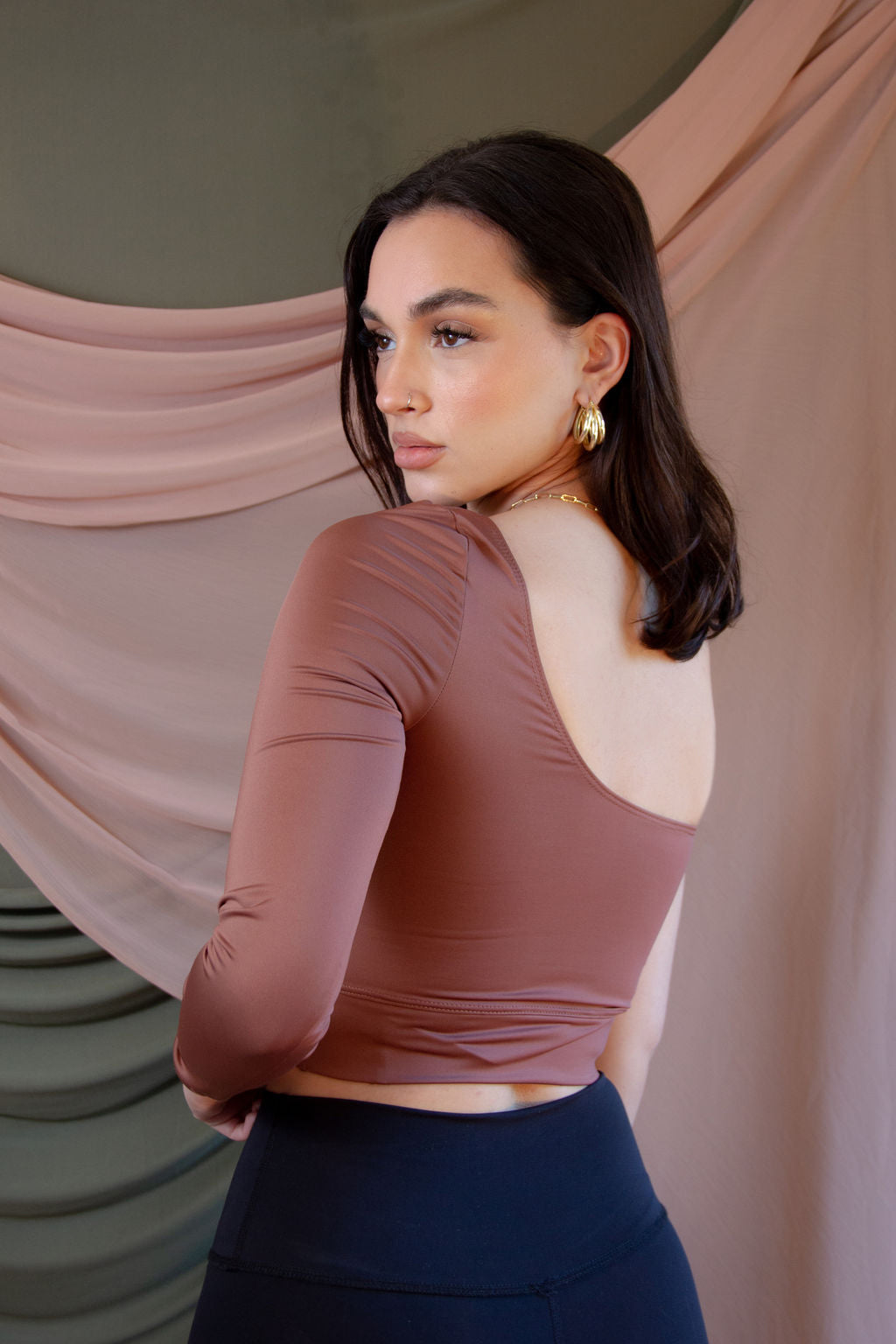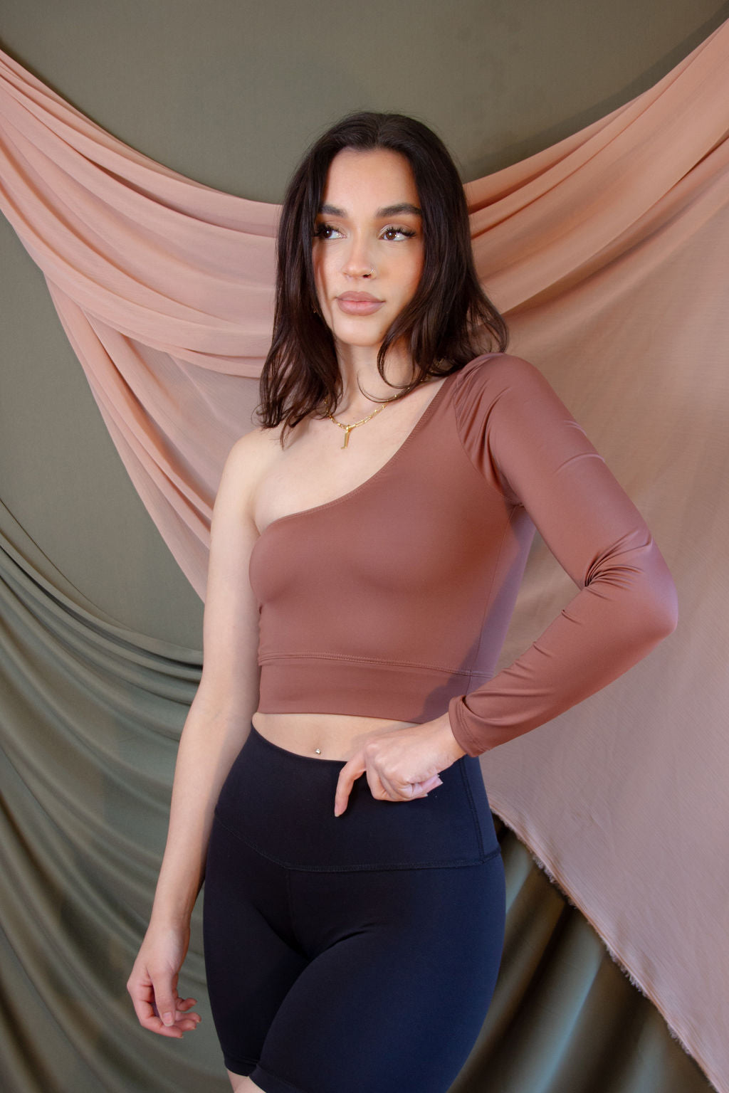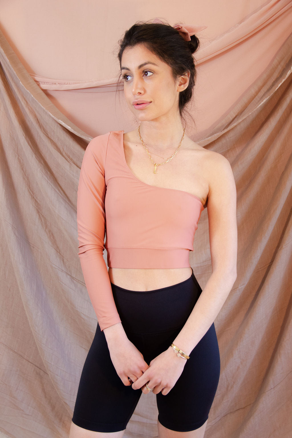 From studio to street. The Air Top is a hybrid workout bra/crop top that will take you from dinner plans to pilates. Featuring a relaxed fit with an asymmetrical one shoulder sleeve for an edgier look. Constructed with seamless, recycled second-skin fabric and dyed with organic, natural ingredients.