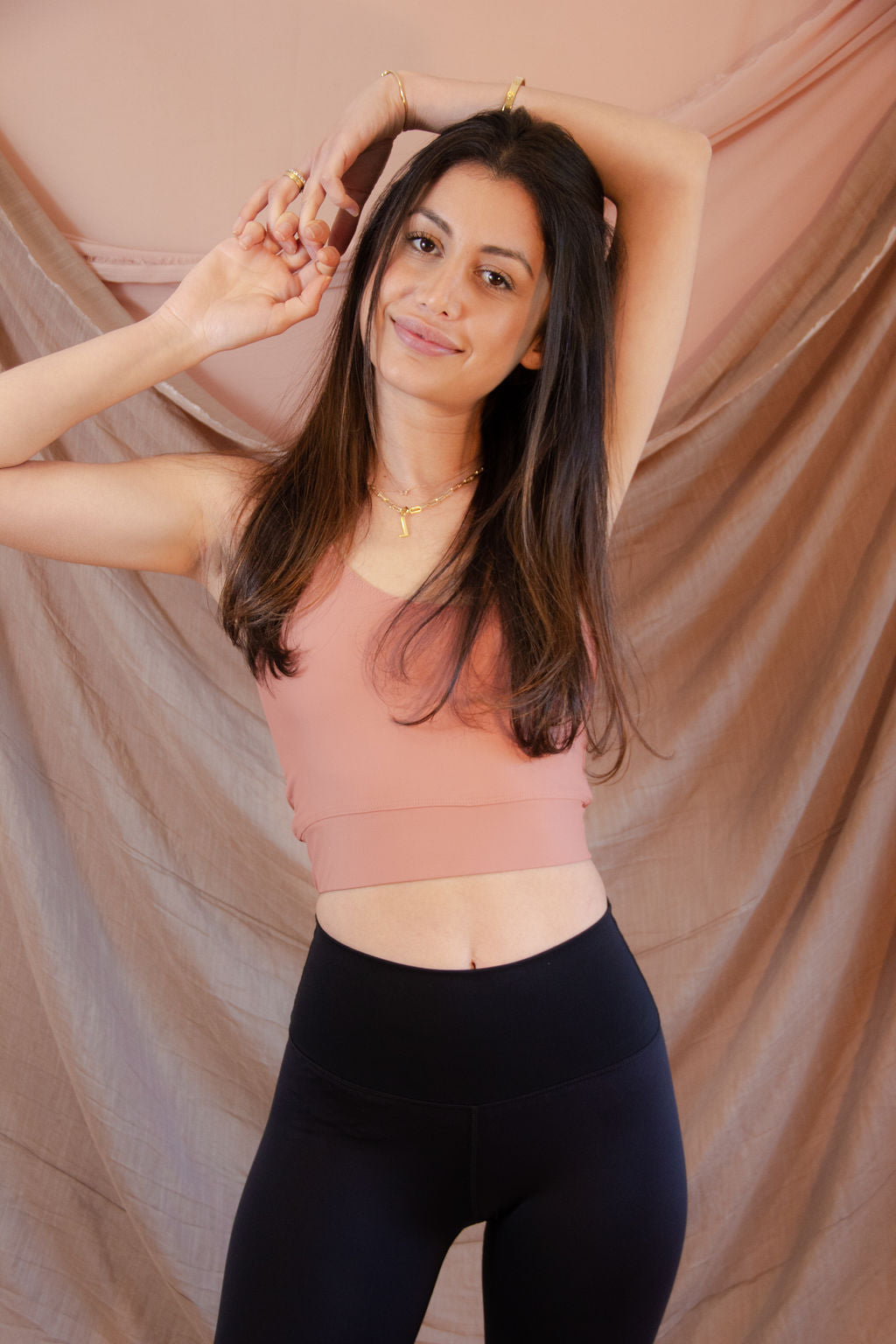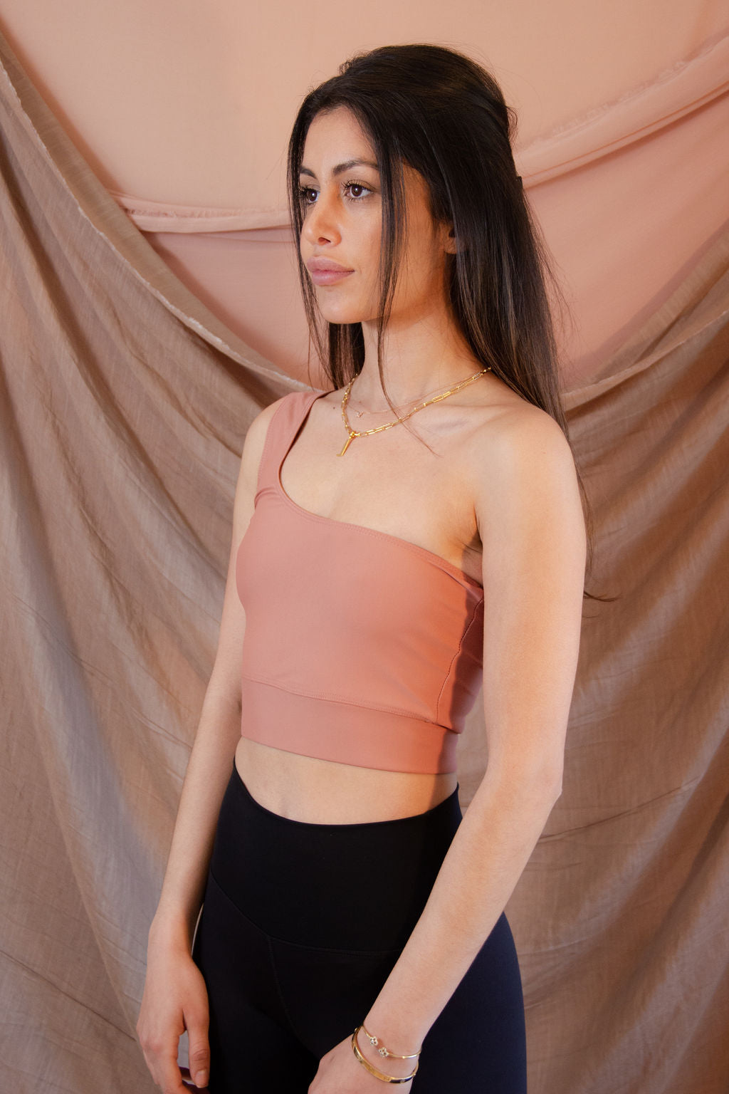 The chameleon of workout tops. The Alice Bra is a hybrid workout bra/crop top that will take you from dinner plans to pilates. Featuring a relaxed fit with an asymmetrical one shoulder strap for an edgier look. Constructed with seamless, recycled fabric and dyed with organic, natural ingredients.