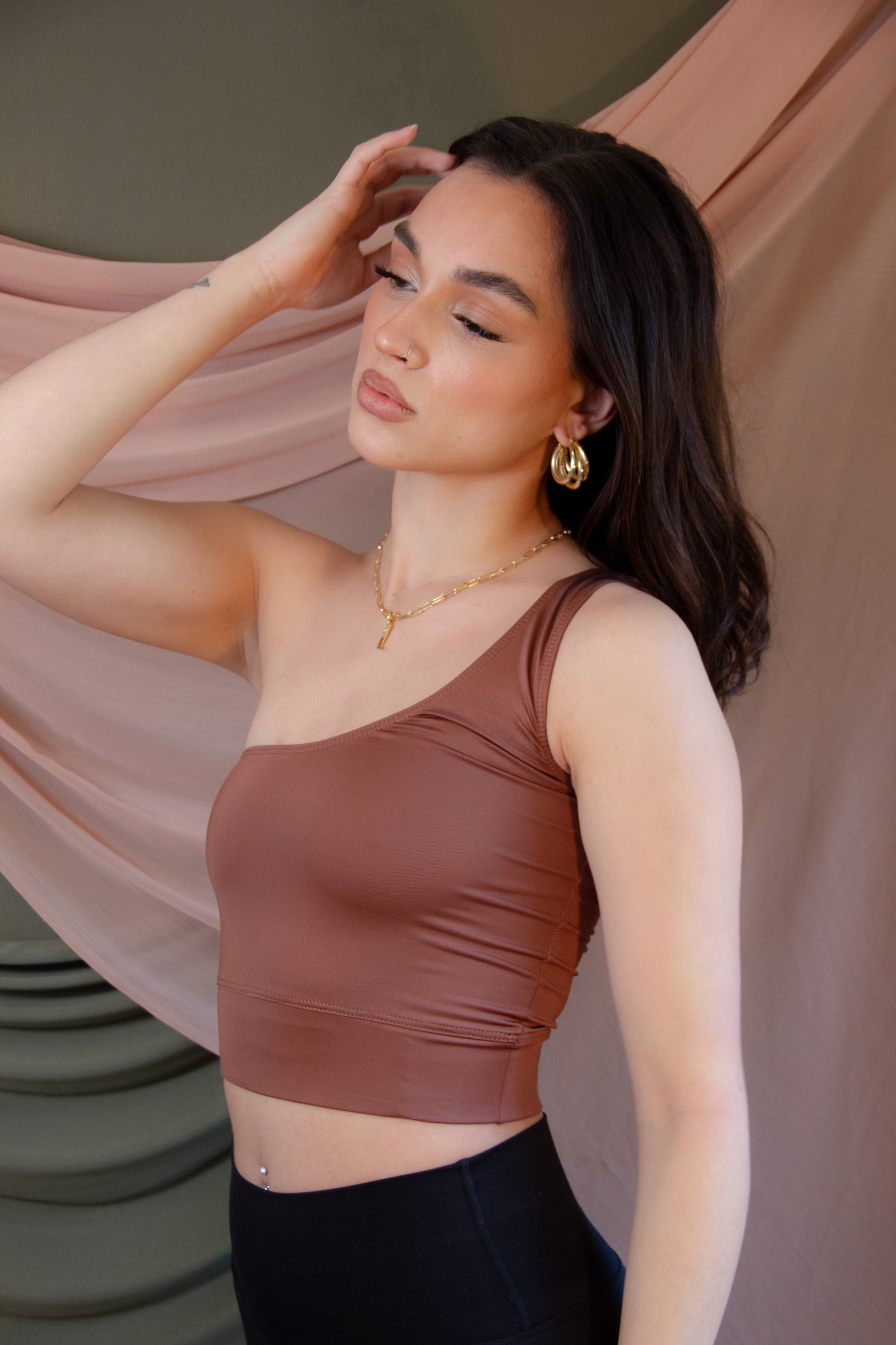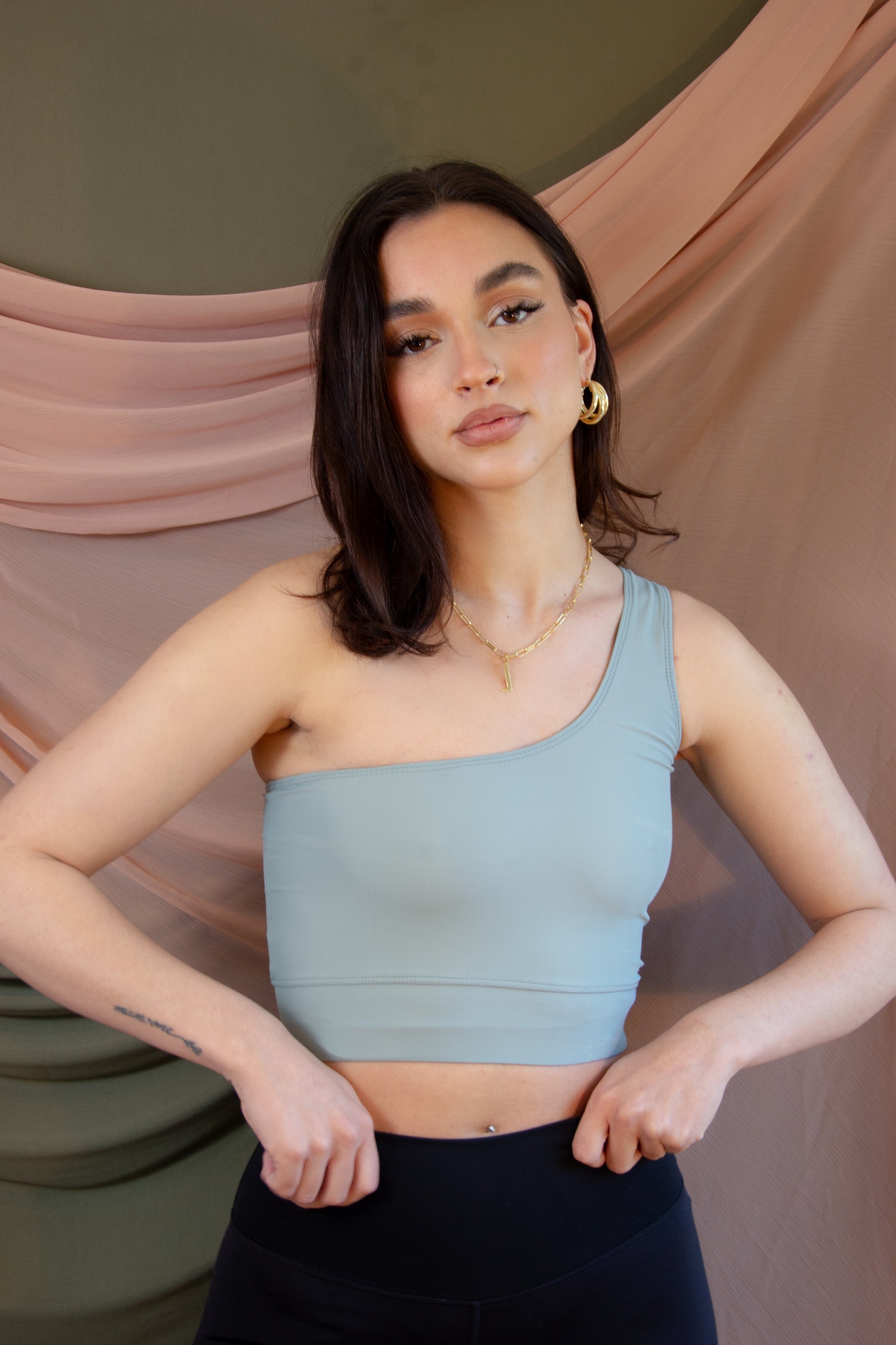 The chameleon of workout tops. The Alice Bra is a hybrid workout bra/crop top that will take you from dinner plans to pilates. Featuring a relaxed fit with an asymmetrical one shoulder strap for an edgier look. Constructed with seamless, recycled fabric and dyed with organic, natural ingredients.