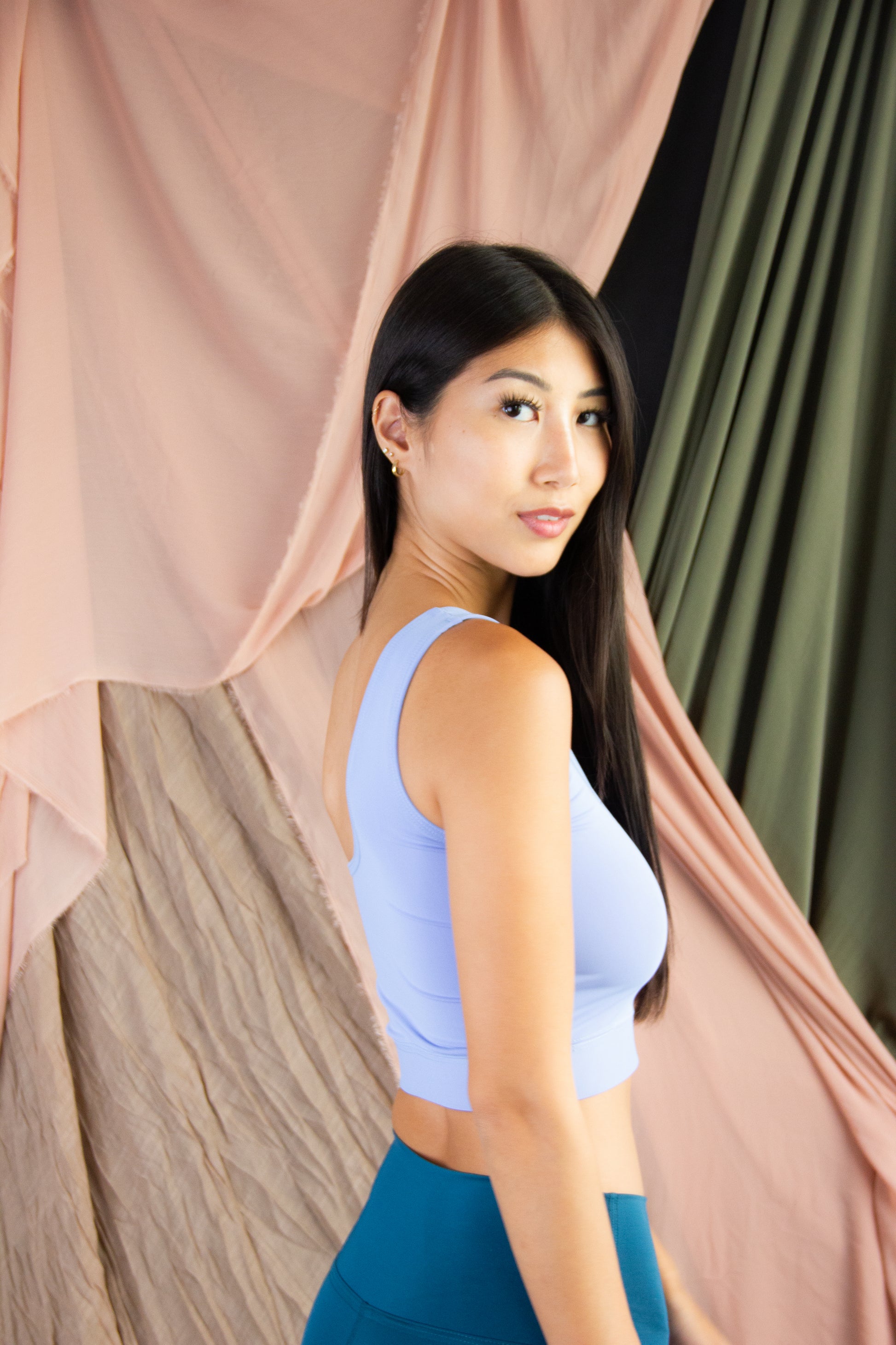 The chameleon of workout tops. The Alice Bra is a hybrid workout bra/crop top that will take you from dinner plans to pilates. Featuring a relaxed fit with an asymmetrical one shoulder strap for an edgier look. Constructed with seamless, recycled fabric and dyed with organic, natural ingredients.